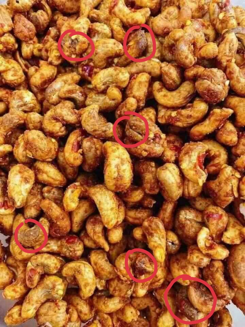 Những khoanh đỏ là hàng sâu. Và đây là những hạt điều bị vàng sẵn chớ không phải là hàng rang muối bóc vỏ lụa sẵn như nhiều người bán đã quảng cáo trước đó.